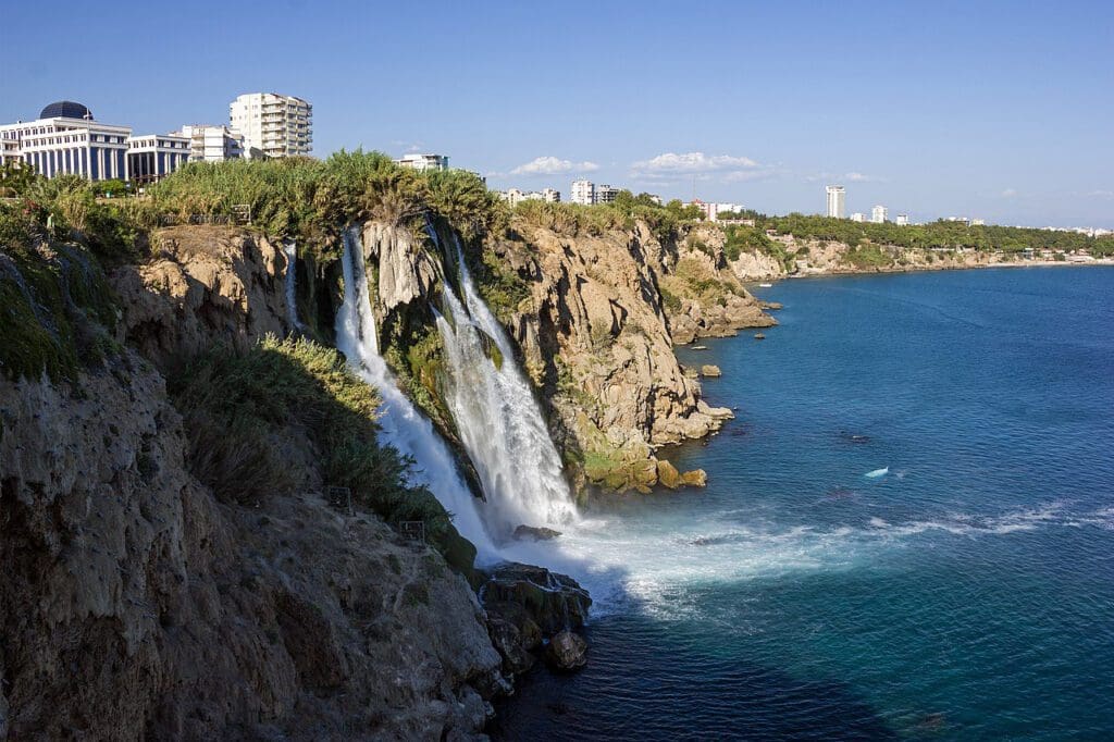 Localizadas no rio Duden, as quedas d’água formam um cenário espetacular ao se lançarem no mar Mediterrâneo.