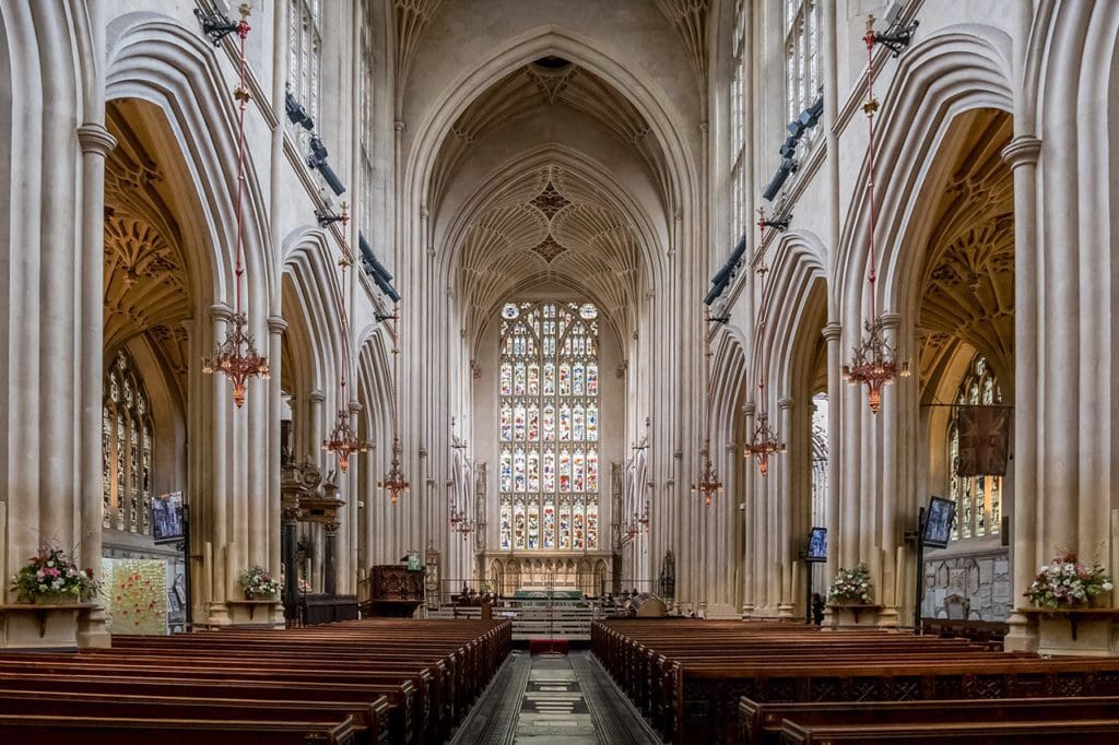 A Abadia de Bath é famosa, não por acaso. Dedicada aos apóstolos Paulo e Pedro, possui enormes vitrais coloridos, estrutura em forma de cruz, arcos e colunas ao mais tradicional estilo gótico inglês.