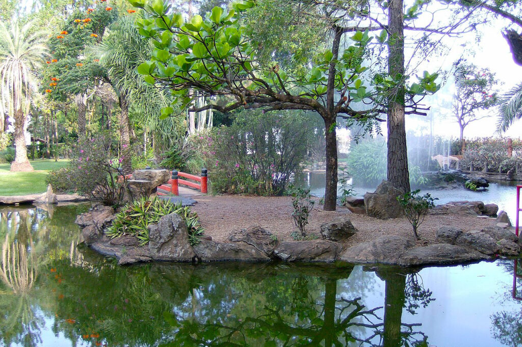 O jardim segue à risca o estilo japonês e, inclusive, conta com lago de carpas, pontes tradicionais de madeira e ornamentação temática.