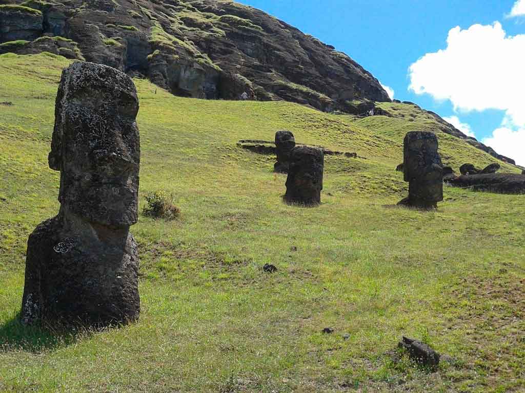 Já em Rano Raraku, ainda estão preservados alguns moais feitos pelos rapanui, mas que não foram “colocados” em seu lugar — era no vulcão que eles esculpiam as estátuas.