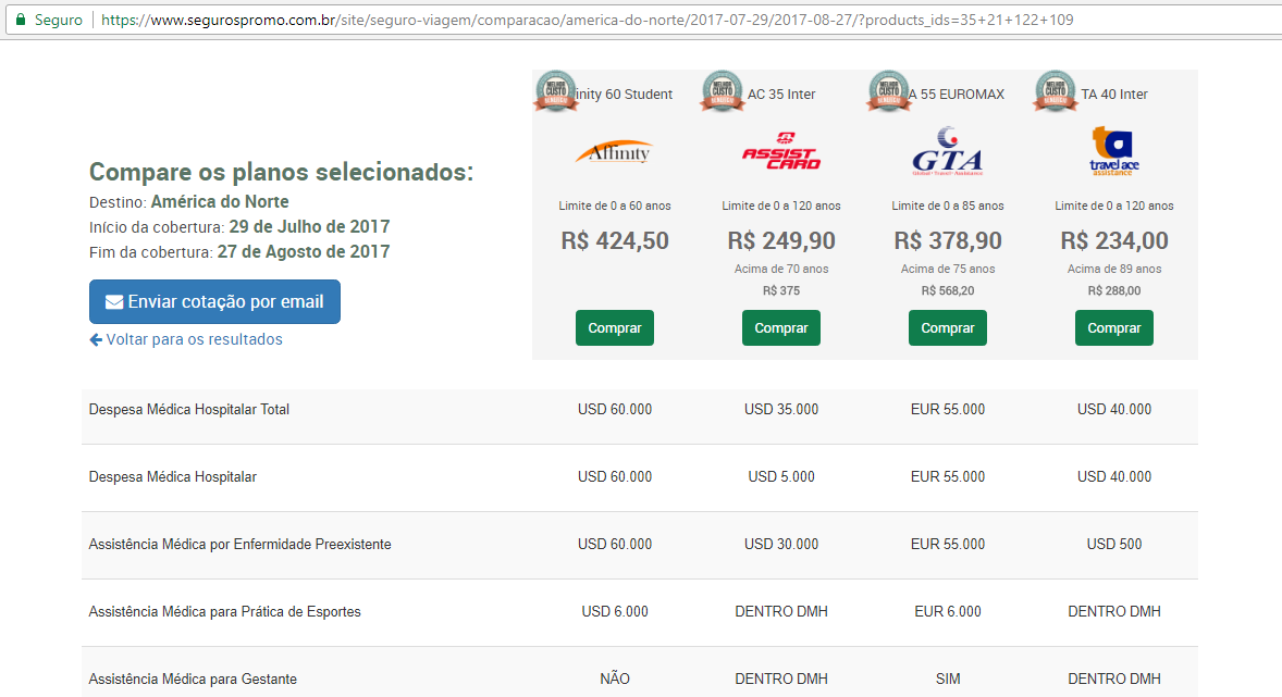 | Plano | Despesas médico-hospitalares | Seguro bagagem | Preço por dia |